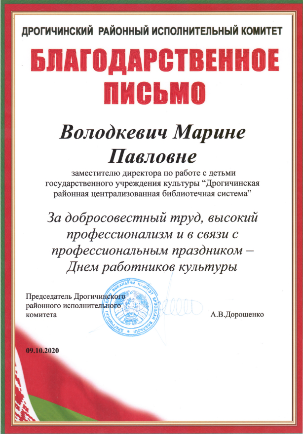 Заместитель директора по работе с детьми Государственного учреждения культуры «Дрогичинская районная централизованная библиотечная система» Володкевич Марина Павловна награждена Благодарственным письмом за добросовестный труд, высокий профессионализм и в связи с профессиональным праздником — Днем работников культуры. Председатель Дрогичинского районного исполнительного комитета А. В. Дорошенко, 9 октября 2020 года.