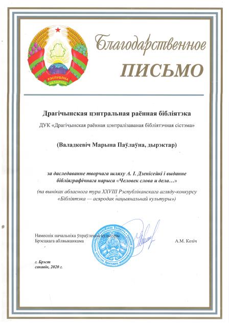 Драгічынская цэнтральная раённая бібліятэка Дзяржаўнай установы культуры «Драгічынская раённая цэнтралізаваная бібліятэчная сістэма» (дырэктар Валадкевіч Марына Паўлаўна) узнагароджана Падзячным лістом за даследаванне творчага шляху А. І. Дзенісейкі і выданні бібліяграфічнага нарысу «Человек слова и дела…». Па выніках абласнога тура XXVIII Рэспубліканскага конкурсу «Бібліятэка – асяродак нацыянальнай культуры». Намеснік начальніка ўпраўлення Брэсцкага абласнога выканаўчага камітэта А. М. Козіч, март 2020 года.