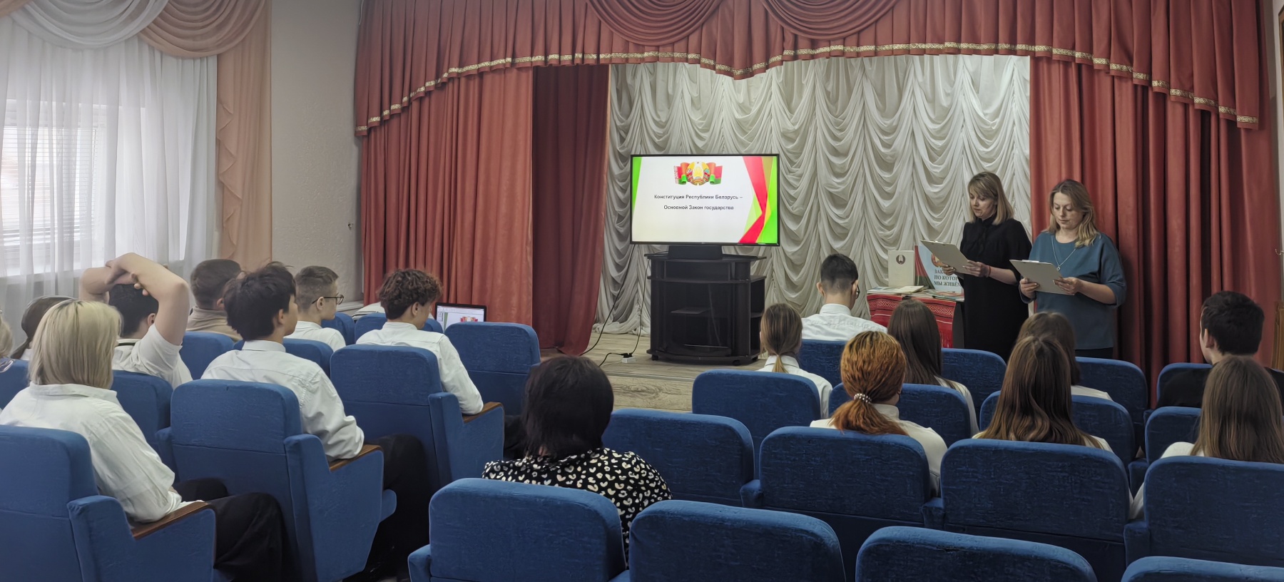 Ведущие мероприятия познакомили ребят с историей создания Конституции, её структурой. Вместе обсудили права и обязанности граждан Республики Беларусь, зафиксированные в основном законе страны. Остановились подробней на принятых изменениях и дополнениях Конституции по итогам республиканского референдума 2022 года и литературой, отражающей историю Беларуси, её развитие и достижения как самостоятельного государства.
