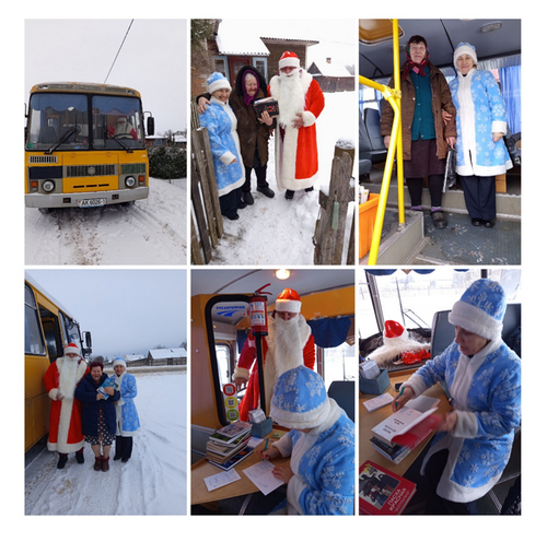 Несмотря на неблагоприятные погодные условия, библиобус продолжает радовать своих любимых читателей книжными новинками и журналами, а также поздравляет всех с новогодними праздниками.