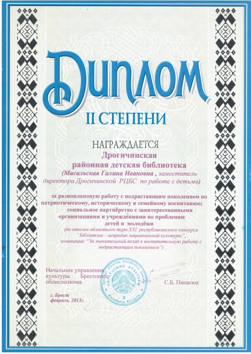 Дрогичинская районная детская библиотека Дрогичинской районной централизованной библиотечной системы (заместитель директора по работе с детьми Масальская Галина Ивановна) награждена Дипломом II степени за разноплановую работу с подрастающим поколением по патриотическому, историческому и семейному воспитанию; социальное партнерство с заинтересованными организациями и учреждениями по проблемам детей и молодежи. По итогам областного тура XXI республиканского конкурса «Бібліятэка – асяродак нацыянальнай культуры», номинация: «За значительный вклад в воспитательную работу с подрастающим поколением». Начальник управления культуры Брестского областного исполнительного комитета С. Б. Панасюк, февраль 2013 года.