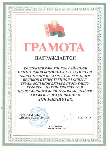Трудовой коллектив Дрогичинской центральной районной библиотеки Дрогичинской районной централизованной библиотечной системы награжден Грамотой за активную общественную работу с ветеранами Великой Отечественной войны и труда, большой вклад в пропаганду героико-патриотического и нравственного воспитания молодежи и в связи с празднованием Дня библиотек. Председатель Дрогичинского районого совета ветеранов С. Е. Лапа, 15 сентября 2005 года.