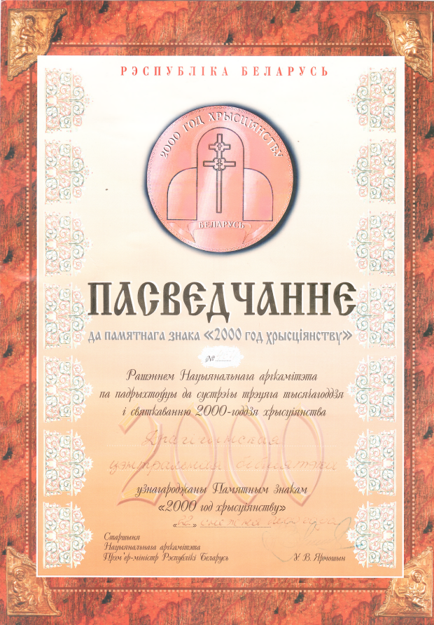 Драгічынская раённая цэнтралізаваная бібліятэчная сістэма ўзнагароджана Памятным знакам «2000 год Хрысціянству». Старшыня Нацыянальнага арганізацыйнага камітэта, Прэм`ер-міністр Рэспублікі Беларусь У. В. Ярмошын, 22 снежня 2000 года.